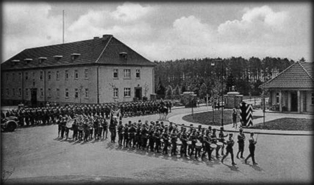 A parade, complete with marching band at the North Main Gate of Bergen-Belsen Barracks. Dated: 1935 - 1945 Source: Unknown