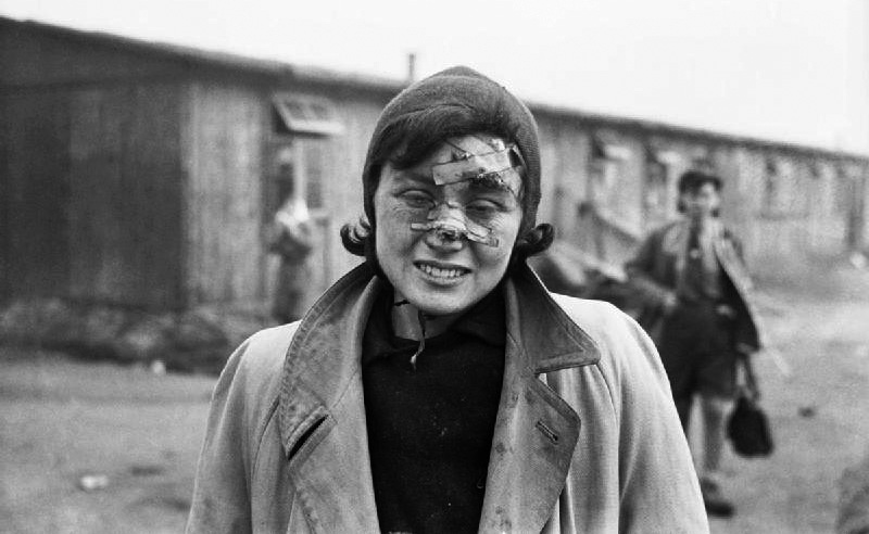 A young woman photographed two days after the British entered the camp; her face still bearing the scars of a beating Photograph/Document Dated: 18 April 1945 Source: Imperial War Museum (BU3746) Image Added: 25/11/2011