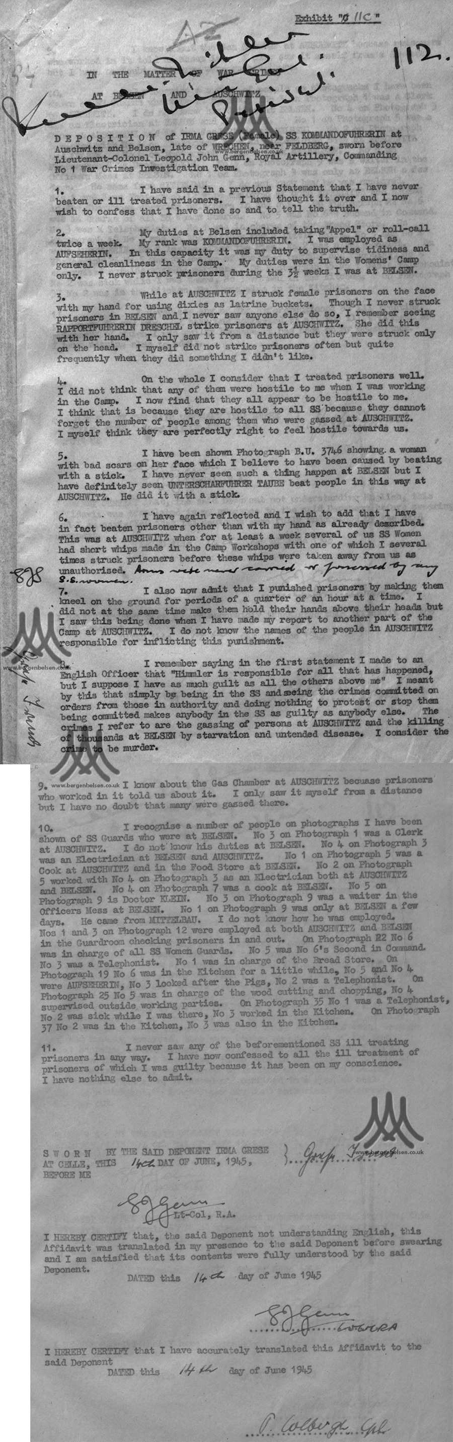 Deposition of Irma Grese (female) SS Kommandoführerin at Auschwitz and Belsen, late of Wrechen, near Feldberg, sworn before Lieutenant Colonel Leopold John Genn, Royal Artillery, Commanding No. 1 War Crimes Investigation Team.