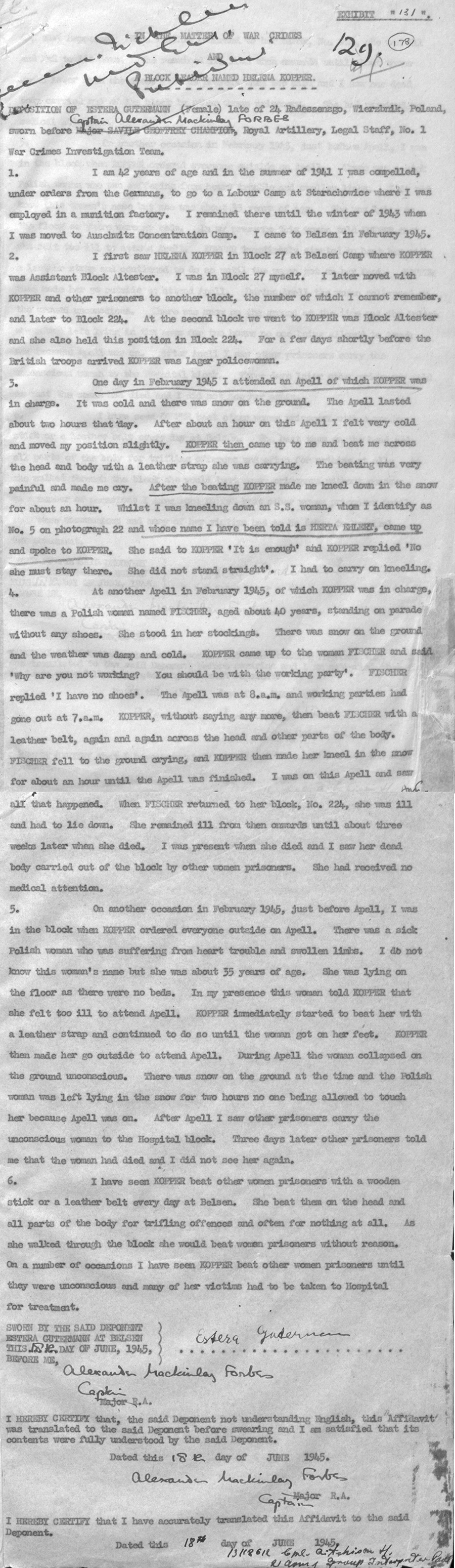 Sworn by the said deponent Estera Gutermann at Belsen this 18th day of June 1945.
